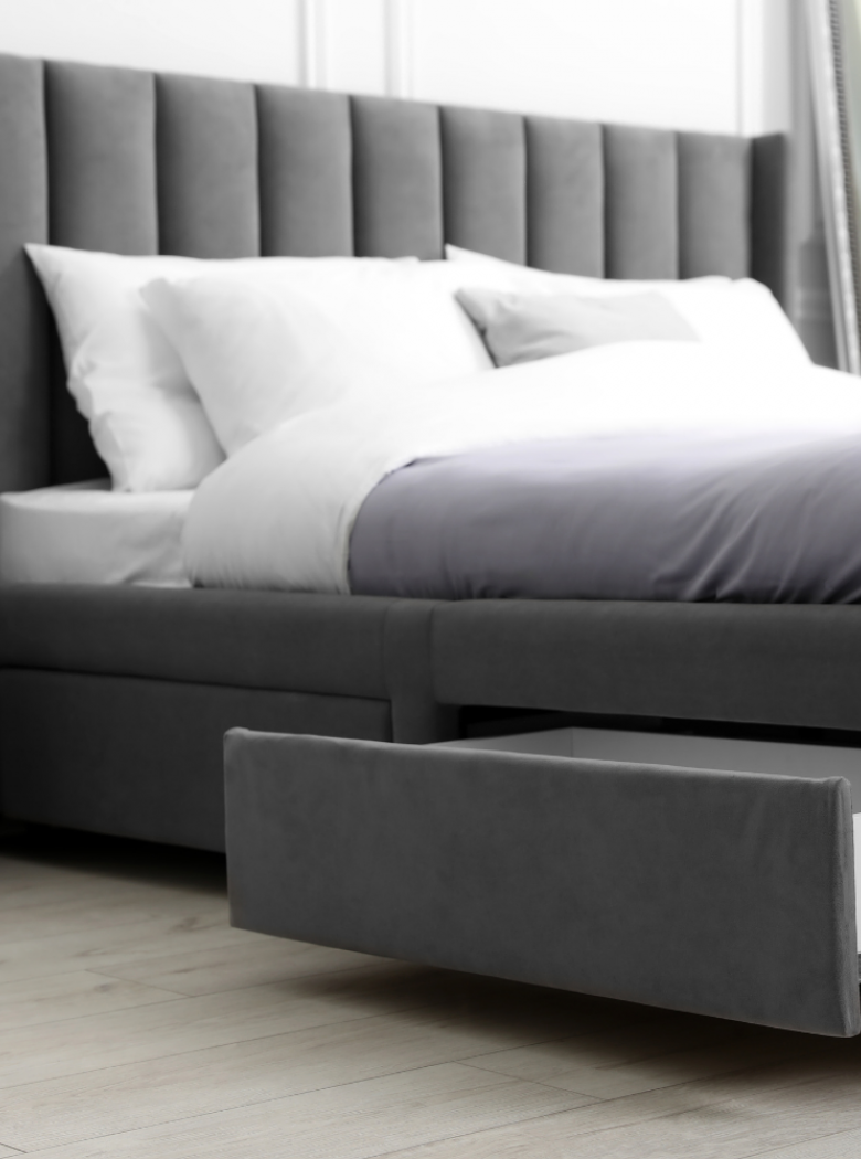 Γνωρίστε το υπέρδιπλο κρεβάτι TRILLOP. Διαθέτει ψηλό κεφαλάρι, επενδυμένο με ανάγλυφο ύφασμα σε ΜΠΕΖ χρώμα με καπιτονέ τεχνοτροπία σε μεγάλα τετράγωνα..